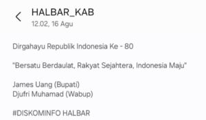 Ucapan HUT RI atas nama Pemda Halmahera Barat, Bupati James Uang dan Wakil Bupati, Djufri Muhamad itu adalah pesan untuk menanamkan semangat rasa cinta dan nasionalisme masyarakat dan seluruh stakeholder dalam menyambut HUT Kemerdekaan RI ke-80 tahun 2025